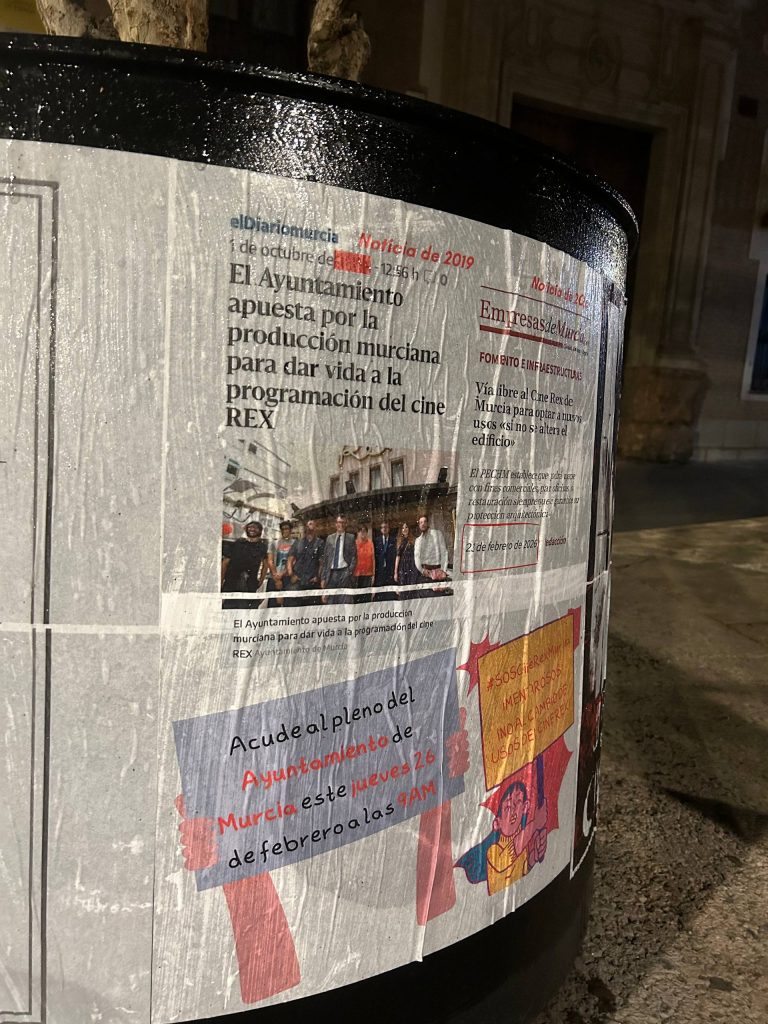 Otra de las piezas de la acción contrapone dos informaciones que evidencian el giro institucional en torno al futuro del inmueble. Mientras una noticia de 2019 recogía la apuesta municipal por la producción murciana como vía para revitalizar la programación del Rex, una información reciente abre la puerta a nuevos usos comerciales, oficinas o restauración siempre que se mantenga la protección arquitectónica del edificio. Para los colectivos, esta evolución simboliza el tránsito de un compromiso con la cultura a la normalización de su sustitución por intereses económicos.