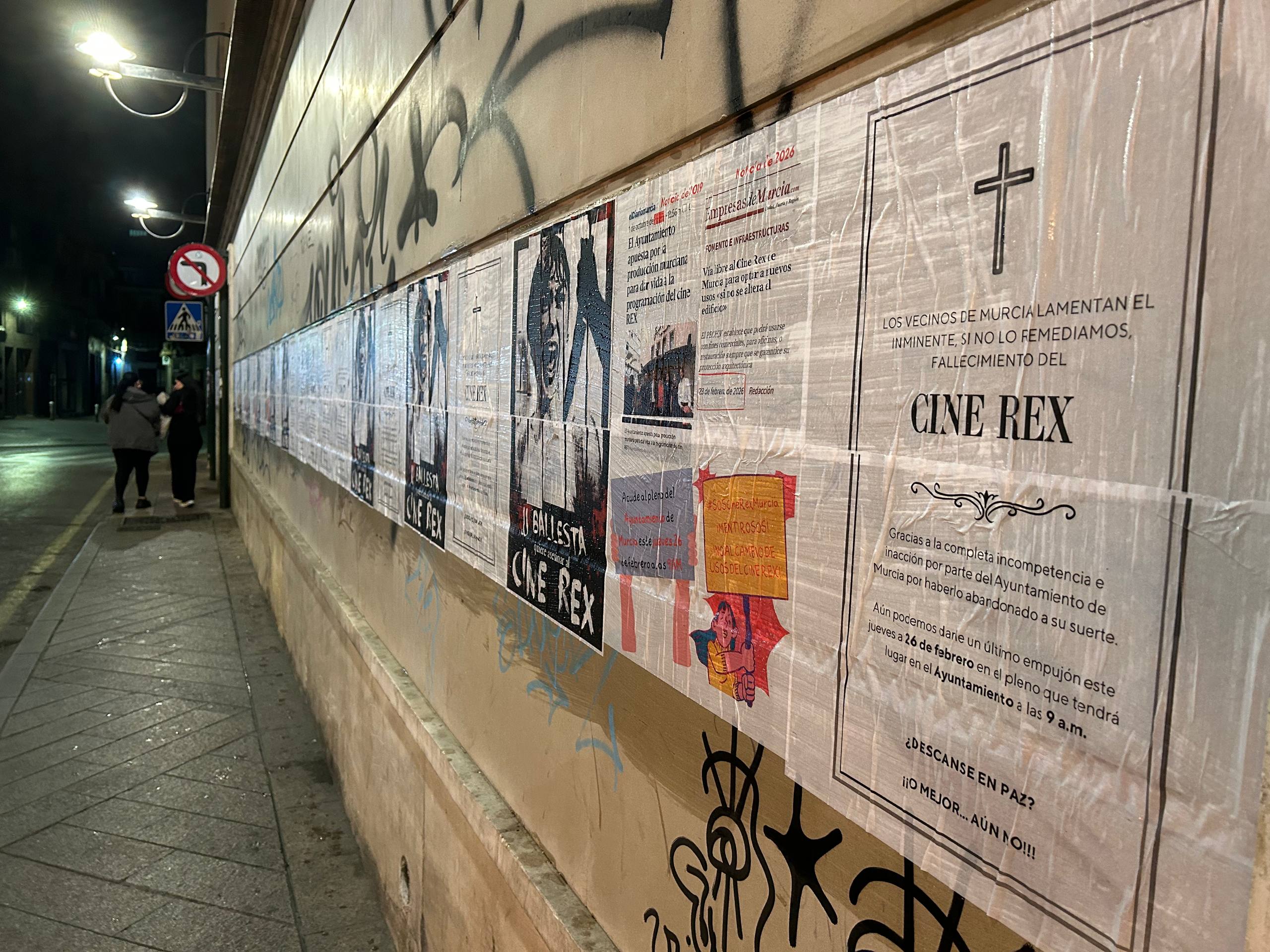 La fachada también ha sido ocupada por una esquela necrológica que simulaba el fallecimiento del cine y en la que los vecinos de Murcia lamentaban su pérdida “a causa de la incompetencia y la inacción municipal tras años de abandono”. El mensaje, lejos de asumir la resignación, apelaba a la movilización social recordando que todavía es posible evitar su desaparición y animaba a la ciudadanía a acudir al pleno municipal de este jueves 26 de febrero a las 9.00 horas para presionar en defensa del edificio y de su función cultural.