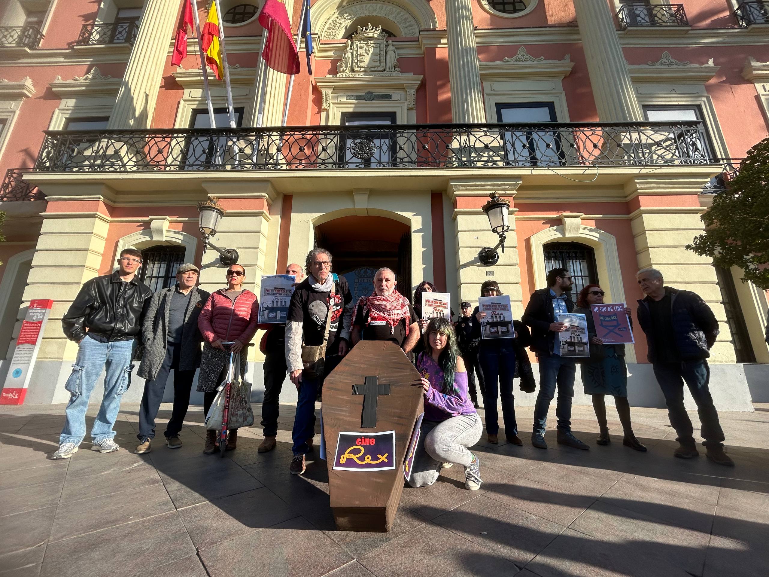 Esta mañana, decenas de ciudadanos y ciudadanas se concentraron a las puertas del Ayuntamiento de Murcia convocados por la plataforma Cine Rex Vivo para protestar por la aprobación en el Pleno municipal de la modificación del Plan Especial de Protección del Conjunto Histórico-Artístico (PECHAM) que afecta al Cine Rex. La decisión abre la puerta a usos comerciales, oficinas y equipamientos privados en un edificio con 111 años de historia, ignorando miles de alegaciones ciudadanas y firmas recogidas durante años de movilización.