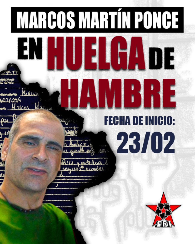 Marcos Martín Ponce, preso político vinculado al GRAPO, inició el pasado lunes 23 de febrero una huelga de hambre indefinida en protesta por la situación de María José Baños Andújar, presa política antifascista, según informó el Socorro Rojo Internacional (SRI).