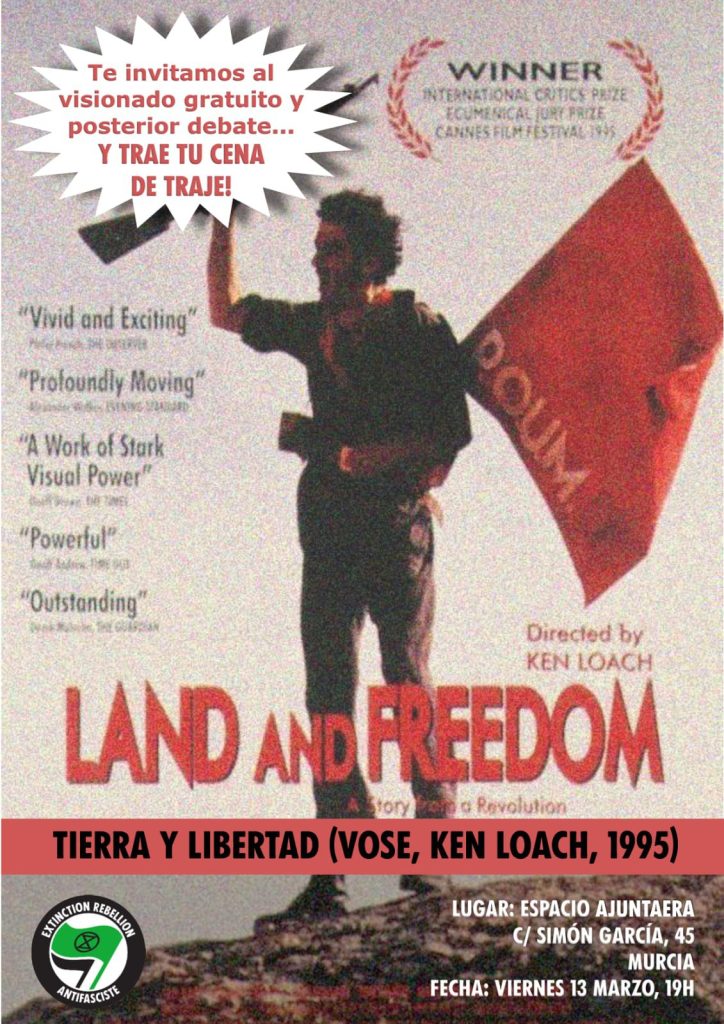 Desde Extinction Rebellion Murcia señalan que la proyección y el debate son una oportunidad para conectar esa historia con las luchas sociales contemporáneas. El comunicado del colectivo recuerda que “las grandes fortunas de la burguesía terrateniente e industrial patrocinan el terror del fascismo para acabar con un movimiento obrero en auge” y que miles de civiles, conocidos como milicianos y milicianas, “ponen sus vidas al servicio de la libertad y la democracia”. Según el texto, estos combatientes se enfrentaron tanto al bando “nacional” como a la II República capitalista y burguesa y, citando el comunicado, lucharon “unidos al gran sindicato español, la CNT y a otros grupos como el POUM”, porque para ellos “la guerra es la oportunidad de la revolución obrera”.