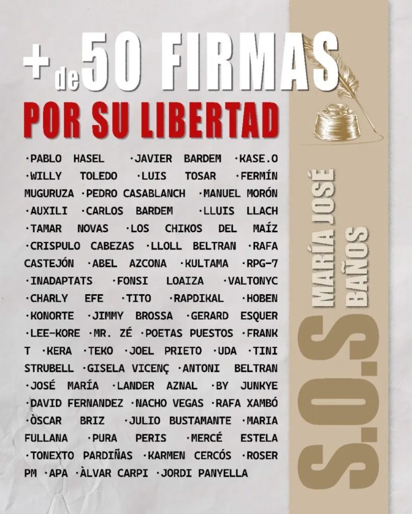 Más de medio centenar de artistas, músicos, actores y creadores del ámbito cultural han firmado un manifiesto público para denunciar la situación de la presa política antifascista María José Baños y exigir su inmediata atención médica en condiciones dignas, así como su puesta en libertad ante el grave deterioro de su estado de salud.
