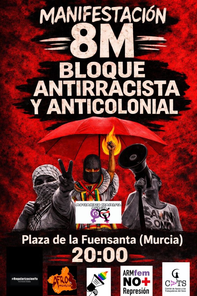 Esta manifestación está convocada por el Movimiento Feminista de Murcia, junto a AfroMurcia, Regularización Ya, Orgullo Crítico, Antirrepresión Murcia y CATS, que consensuaron los detalles y organización conjunta en asamblea abierta, difundida por redes con mucho tiempo de antelación. Ante ataques en redes sociales y acusaciones de egos y división, queremos hacer constar públicamente que la manifestación convocada por la mañana no ha sido una propuesta abierta a la co-organización en ningún momento. Que se hizo de manera unilateral y sin contar con todas.