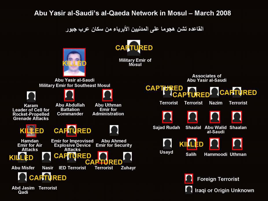 Diagrama difundido por las fuerzas de la Coalición tras haber abatido a Abu Yasir al-Saudi, emir militar (líder operativo) de Al Qaeda en Irak para el sureste de Mosul, en un ataque aéreo el 27 de febrero. La figura situada en la parte superior de la red es Abd-al-Rahman, emir militar de Mosul, quien fue capturado el 18 de febrero.