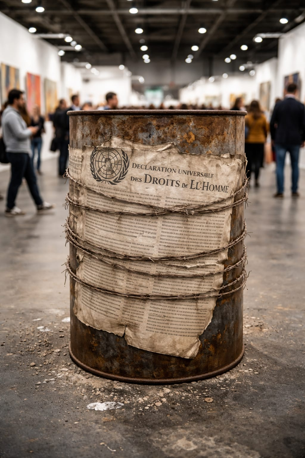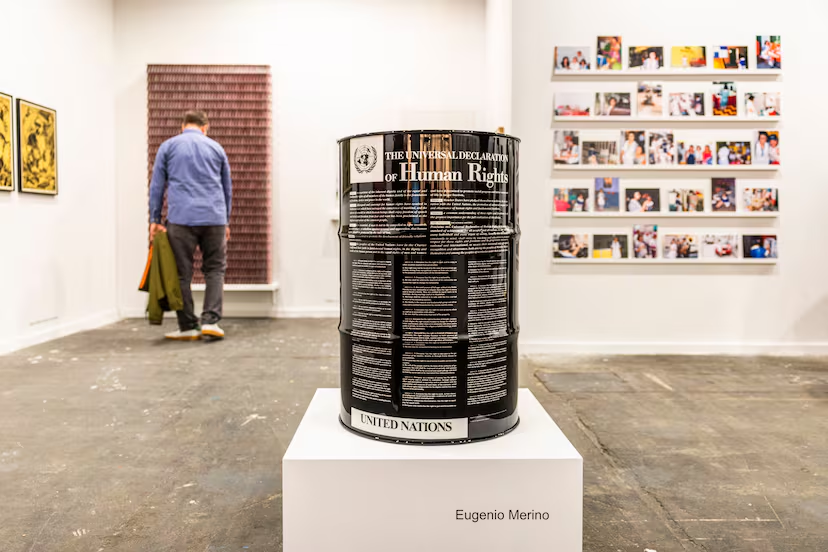 Así comienza una nueva edición de esta feria en la que, una vez más, la reivindicación más política queda encapsulada en las denominadas piezas polémicas, una etiqueta que ya es una tradición en ARCOmadrid. Entre las 211 galerías, de 30 países, que participan este año, hay que dirigir los pasos siempre hacia un puñado para saciar esta necesidad. El recorrido suele comenzar en la galería ADN, donde Eugenio Merino hace de las suyas; en esta ocasión con “Petróleo”, un bidón de este combustible fósil sobre el que ha estampado la Declaración Universal de los Derechos Humanos.