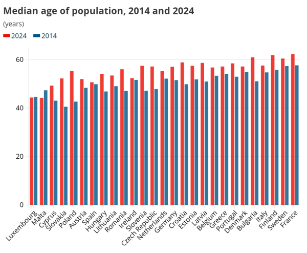 Italia, Portugal y Bulgaria registrarán los mayores porcentajes de población mayor de 65 años de la UE en 2024. Pero, ¿cómo evolucionará la demografía del bloque hasta 2100?