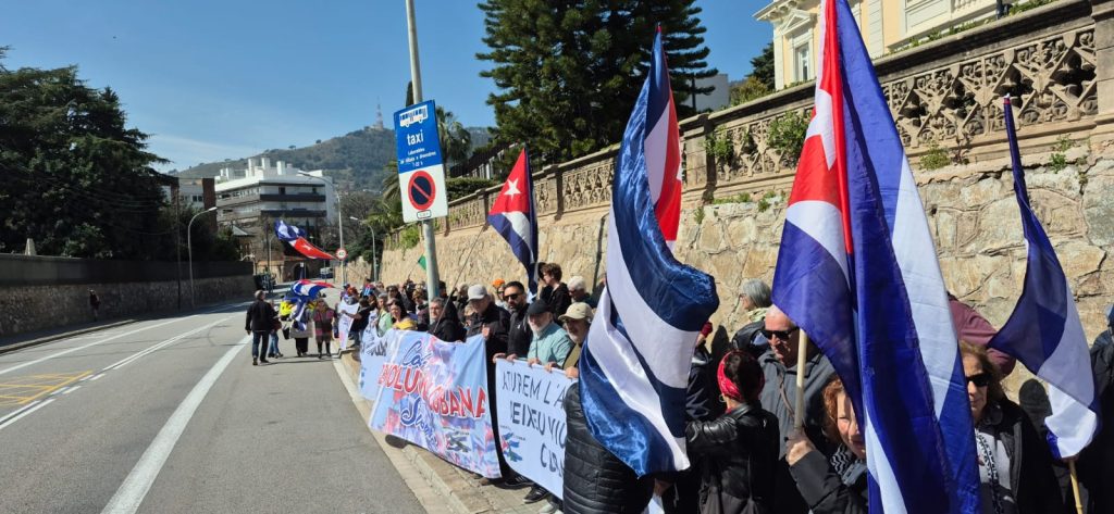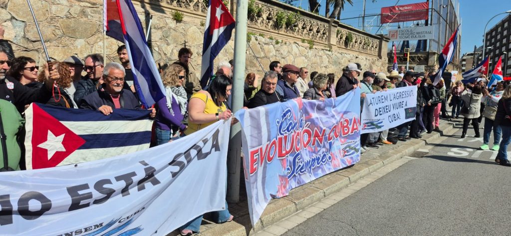 Este sábado 21 de marzo, frente al consulado de Estados Unidos en Barcelona, tuvo lugar una concentración convocada por Defensem Cuba para denunciar el bloqueo contra Cuba y mostrar apoyo al convoy internacional de solidaridad “Nuestra América”, actualmente en la Isla.