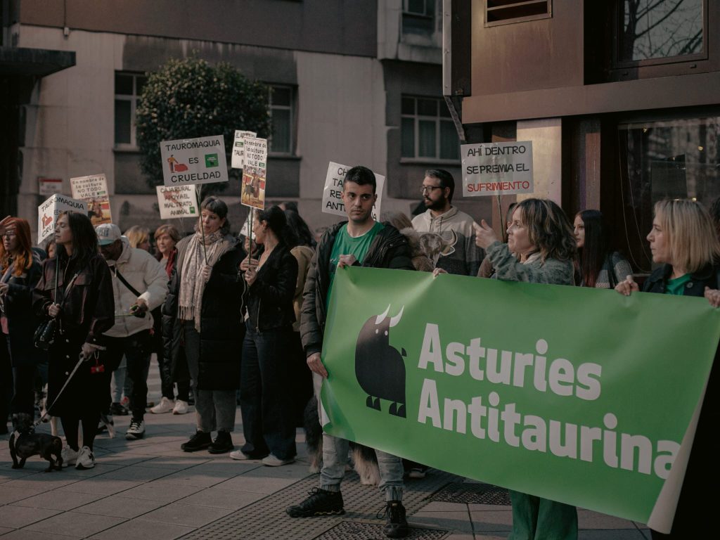 Colocados estratégicamente frente a la sede de Caja Gijón, en cuyo interior tenía lugar la última de las ponencias del ciclo “cultural” taurino organizado por la Peña Astur, los antitaurinos mostraron su rechazo a que una práctica que tortura y maltrata animales hasta la muerte reciba premios y apoyo institucional.